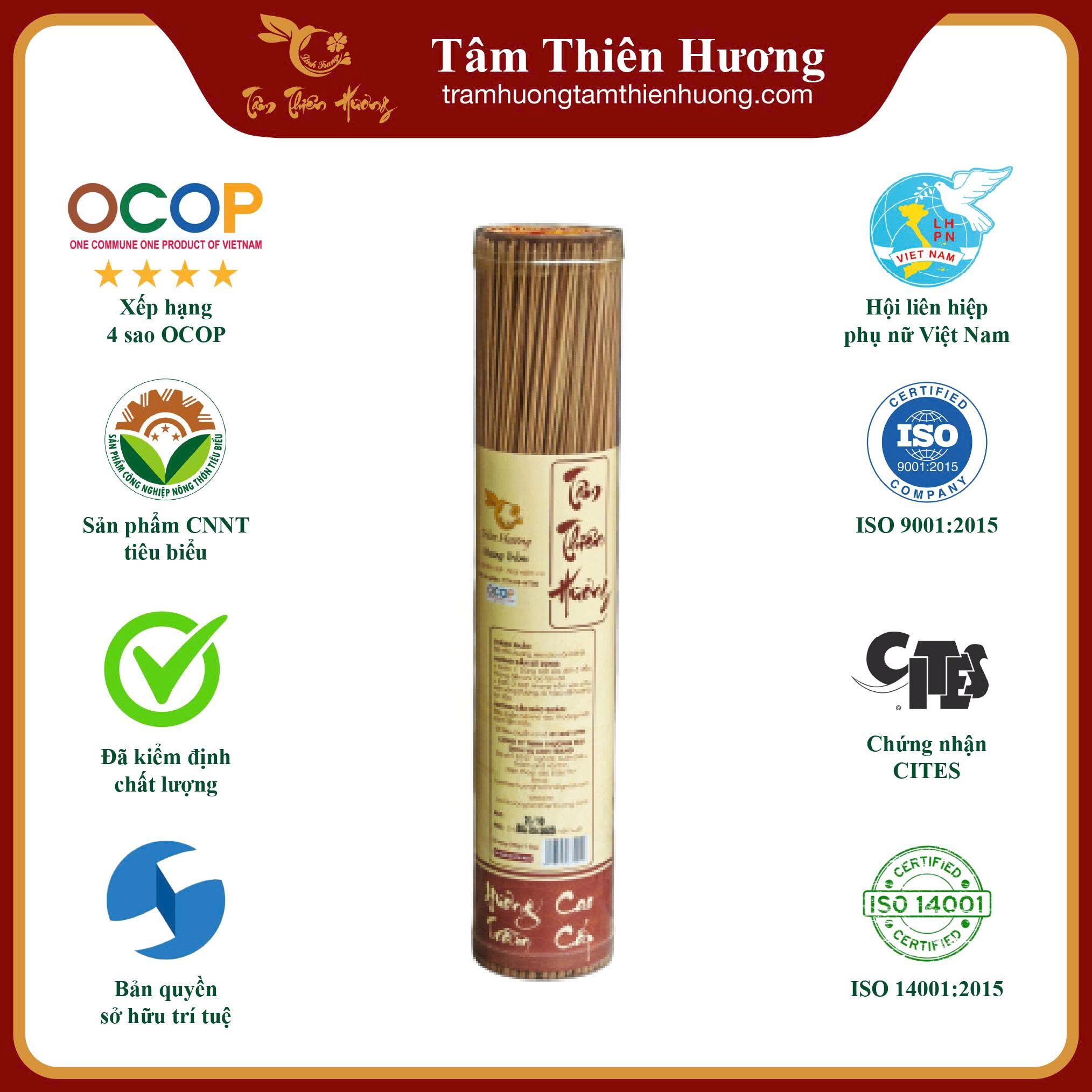 Nhang trầm Tâm Thiên Hương là sản phẩm nhang sạch, làm từ nguyên liệu 100% từ trầm hương được khai thác tại Hà Tĩnh, keo bời lời và tăm tre. Đáp ứng nhu cầu thắp hương, cúng bái và đảm bảo an toàn cho sức khỏe người sử dụng. Tất cả các sản phẩm nhang trầm Tâm Thiên Hương đều đáp ứng quy trình kiểm định chất lượng và nồng độ trong khói hương đạt tiêu chuẩn của Trung Tâm Kỹ Thuật Tiêu Chuẩn Đo Lường Chất Lượng 2 – Thừa Thiên Huế. Nhang trầm Tâm Thiên Hương trở thành thương hiệu hương sạch liên tục được công nhận là Sản phẩm Công nghiệp nông thôn tiêu biểu cấp Tỉnh. Nhang Trầm Tâm Thiên Hương không chứa các thành phần độc hại, đảm bảo an toàn sức khỏe cho người sử dụng, đặc biệt an toàn với người bị mũi nhạy cảm.