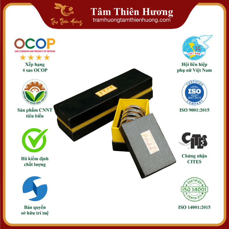 Vân Mây Tâm Thiên Hương là sản phẩm làm từ nguyên liệu 100% từ trầm hương được khai thác tại Hà Tĩnh. Tất cả các sản phẩm Tâm Thiên Hương đều đáp ứng quy trình kiểm định chất lượng và nồng độ trong khói hương đạt tiêu chuẩn của Trung Tâm Kỹ Thuật Tiêu Chuẩn Đo Lường Chất Lượng 2 – Thừa Thiên Huế. Sản phẩm Tâm Thiên Hương không chứa các thành phần độc hại, đảm bảo an toàn sức khỏe cho người sử dụng, đặc biệt an toàn với người bị mũi nhạy cảm.